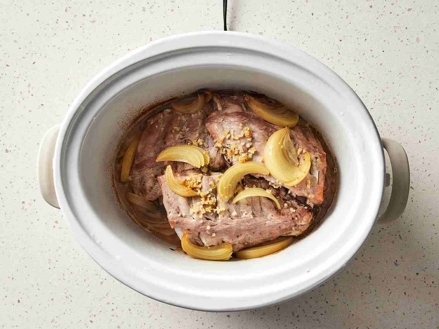 - Step 3:Pour 1/2 cup water into the slow cooker, then add ribs. Scatter onion and garlic over top. Cover and cook on Low for 8 hours or High for 4 hours. Dotdash Meredith Food Studios