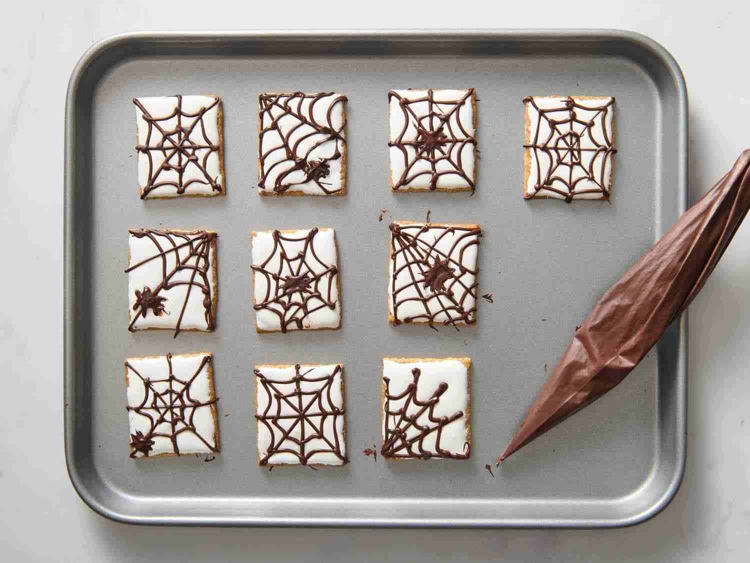 - Step 5:Pipe chocolate in the shape of a spider web onto the marshmallow fluff of each graham cracker. Put a dot with some legs in the corner to represent a spider. Allrecipes/Julia Hartbeck